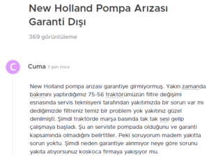 New Holland pompa arızası garantiye girmiyormuş. Yakın zamanda bakımını yaptırdığımız 75-56 traktörümüzün filtre değişimi esnasında servis teknisyeni tarafından yakıtımızda bir sorun var mı dediğimizde filtreniz temiz bir problem yok yakıtınız güzel denilmişti. Şimdi traktörde marşa basında tak tak sesi gelip çalışmaya başladı. Şu an serviste pompada olduğunu ve garanti kapsamında olmadığını belirttiler. Peki soruyorum madem yakıtta sorun yoktu. Şimdi neden garantiye alınmıyor neye göre sorunu yakıta atıyorsunuz koskoca firmaya yakışıyor mu.