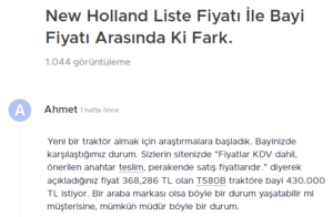 368.000 TL olan traktör de bayinin yeterli bir kâr payı olduğu düşüncesindeyim. 430.000 TL nedir Allah aşkına. Ben Koç markasına Allah var yukarıda şu durumu yakıştıramadım net. Bunu burda yazma nedenim de 3 sefer kendi New Holland sitenizde göndermeye çalıştım ama hep hatadan dolayı gönderilemedi diye mesaj oluşması.