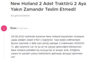 29.08.2022 tarihinde Karaman New Holland bayisinden sözleşme yapıp aldığım 2adet tr160 s traktörler hala teslim edilmemiştir. Bunun üzerinde 2 defa zam yemiş yaklaşık 2 makineden 400000 TL gibi zararımız var ve şu an ne zaman geleceğimi bilmiyorum. New Holland yetkilileri bu konuya bir el atsalar artık. Ettiğimiz zarara mı yanalım yoksa traktörlerin gelmeyip aksayan işlerimize mi?