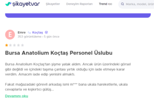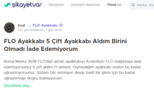 Bursa Marka AVM ® FLO’dan alınan ayakkabıyı Anatolium FLO mağazaya iade edemiyorsunuz 5 çift aldım 1’i olmadı. Giymediğim ayakkabı neden bu kadar uğraştırıyorsunuz. Sistem izin vermiyor deyip basit bir işlem için bu kadar uğraştırmayı doğru bulmuyorum.