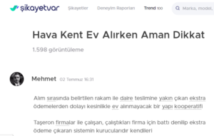 Ancak şikayet var com da Hava Kent Yapı Kooperatifi hakkında dikkat çeken şikayetler gözden kaçmadı.