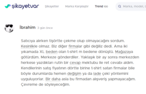 Satıcıya alırken tişörtte çekme olup olmayacağını sordum. Kesinlikle olmaz. Biz diğer firmalar gibi değiliz dedi. Ama iki yıkamada XL beden olan t-shirt m bedene dönüştü. Mağazaya götürdüm. Merkeze gönderdiler. Yaklaşık bir ay sonra merkezden herkese yazdıkları rutin bir cevap mektubu ile ret cevabı aldım. Kendilerinin satış fiyatının dörtte birine t-shirt satan firmalar bile böyle durumlarda hemen değişim ya da iade çeki yöntemini uyguluyorlar. Bir daha asla bu firmadan alışveriş yapmayacağım. Çevreme de söyleyeceğim.