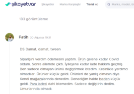 Siparişini verdim ödemesini yaptım. Ürün gelene kadar Covid oldum. Sonra ailemde çıktı. İyileşene kadar iade hakkım geçmiş. Ben sadece olmayan ürünü değiştirmek istedim. Kesinlikle yardımcı olmadılar. Ürünler küçük geldi. Ürünleri de yanlış olmasın diye. Kendi mağazalarında denedim. Denediğim halde beden küçük geldi. Para iadesi dahi istemedim. Sadece değiştirin dedim. Umurlarında olmadı.