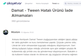 Ankara Kentpark Damat Tween mağazasından aldığım takım elbise bir defa giyindim ve kuru temizlemesi yapıldı. Üründe çekme oldu. Likralı bir ürün olmasından kaynaklı olduğunu düşünüyorum. Geri dönüş kullanım hatası olduğu yönünde aynı gün aldığım smokin ilk kullanımda ağı yırtıldı onu da göndermeyi düşünüyorum. Bakalım o da kullanım hatası olarak mı dönecek vip müşterisi olmama rağmen bu tarz dönüşler beni gerçekten üzdü. Bu saatten sonra kapılarından içeriye adım dahi atmayı düşünmüyorum. Diyelim ki kullanıcı hatası bugün Damat Tween den daha düşük seviyede markalar ürünlerini sorgusuz sualsiz iade alırken Damat Tween hiç yakışmadı. Gerçekten bir de ürünü teslim almamı söylüyorlar ne yapacağım çocuğa mı giydireceğim çekmiş ürünü
