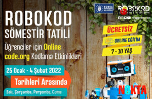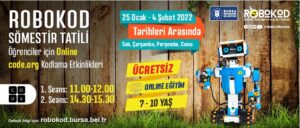Sömestrde ücretsiz kodlama eğitimi Bursa Büyükşehir Belediyesi, ‘evlatların bilim ve teknolojiyi sevmeleri, teknolojiyi sadece tüketen değil hem de üreten bireyler haline gelmeleri için’ yarıyıl tatilinde parasız online kodlama ve yazılım eğitimi programı düzenledi. Robokod kodlama ve yazılım otobüslerinde yüz yüze verilen sadece pandemi sebebiyle online yapılmaya geçindiren kodlama ve yazılım eğitimleri, sömestr tatilinde de devam ediyor.