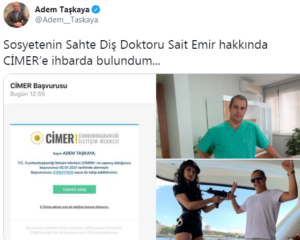 Adem Taşkaya Twitter paylaşımında, “Sosyetenin Sahte Diş Doktoru Sait Emir hakkında CİMER’e ihbarda bulundum…” diyerek bu kişi hakkında harekete geçtiğini duyurdu.