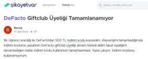 Bir öğrenci aracılığı ile DeFacto’dan 500 TL indirim kodu kazandım. Alışverişimi tamamladığımda indirim kodumu yazarken DeFacto giftclub üyeliği almam istendi aldım fakat üyeliğimi tamamladığım halde indirim kodu kullanırken tamamlanmadı. Yazısı çıkıyor. İndirim kodumu kullanamıyorum.