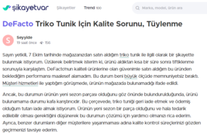 Sayın yetkili, 7 Ekim tarihinde mağazanızdan satın aldığım triko tunik ile ilgili olarak bir şikayette bulunmak istiyorum. Üzülerek belirtmek isterim ki, ürünü aldıktan kısa bir süre sonra tiftiklenme sorunuyla karşılaştım. DeFacto’nun kaliteli ürünlerine olan güvenimle satın aldığım bu üründen beklediğim performansı maalesef alamadım. Bu durum beni büyük ölçüde memnuniyetsiz bıraktı. Müşteri hizmetleri ile yaptığım görüşmede, ürünün mağazada bulunamadığı ifade edildi.