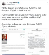 “TBMM Başkanı Mustafa Şentop TÜGVA ile ilgili önergemi ‘Kişisel’ bularak iade etti. TÜGVA yeni bir paralel yapı mı? TÜGVA bugüne kadar hangi kamu kurumuna kaç kişiyi torpille soktu? sorularımın neresi kişisel? Ama kişisel bir konu var; o da Şentop’un TÜGVA Eğitimcisi olması!”