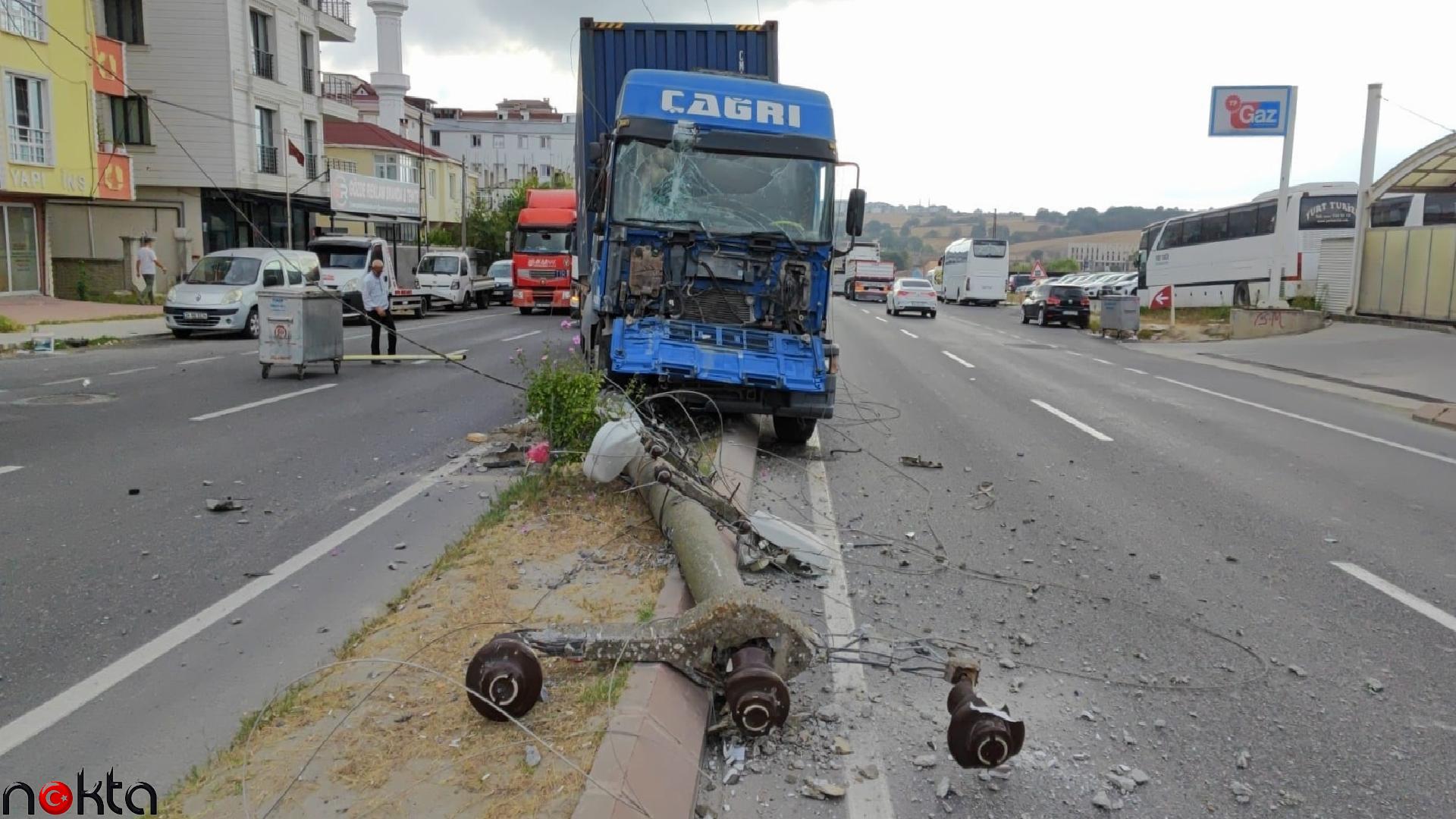 Çerkezköy’de tırın elektrik direğini devirmesi nedeniyle yol trafiğe kapandı.