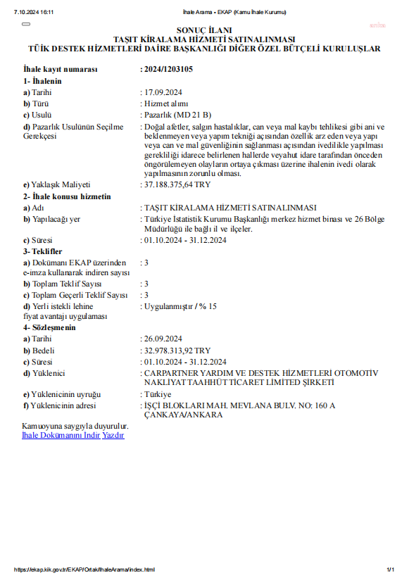 İhaleyi, 32 milyon 978 bin lira sözleşme bedeli ile Mehmet Kaya’ya ait olan Carpartner Yardım ve Destek Hizmetleri Otomotiv Nakliyat Taahhüt Ticaret Limited şirketi kazandı. 26 Eylül 2024’te imzalanan ihaleye göre; TÜİK 3 aylık taşıt kiralama ihalesi için her ay 10 milyon 992 bin lira ödeyecek.