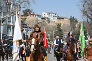 Mehter takımının marşları eşliğinde başlayan kortej yürüyüşü, yoğun katılımla gerçekleşti. Bursa Valisi Yakup Canbolat, Büyükşehir Belediye Başkanı Alinur Aktaş ve konuk bakanların da katıldığı korteje; atlı birlikler, okçular, kılıç kalkan ekibi ve konuk ülkelerden gelen halk dansları ekipleri ayrı bir renk kattı. Vatandaşların da ilgiyle takip ettiği yürüyüş, Ertuğrulbey Meydanı’nda tamamlandı. Meydanda düzenlenen etkinliklerde mehter marşları ve kılıç kalkan gösterisi ilgiyle izlendi. Buradaki törende kısa bir konuşma yapan Bursa Büyükşehir Belediye Başkanı Alinur Aktaş,