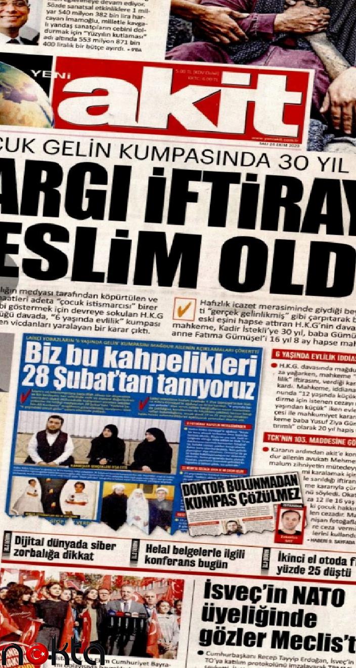 Mahkemenin aldığı kararda H.K.G’nin zorla evlendirildiğinde 14,5 yaşında olduğunu tespit etmesini Yeni Şafak ve Akit kaçırmadı. Akit, haberi ‘çocuk gelin kumpası’ olarak ele aldı ve ‘Yargı iftiraya teslim oldu’ başlığıyla manşetten verdi. Yeni Şafak da ‘6 yaş yalanı çöktü’ dedi.