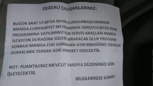 “Bugün saat 17.00’de sayın Cumhurbaşkanımızın Manisa Cumhuriyet Meydanı’nda gerçekleşecek olan programına katılımınız için servis araçları Manisa istasyon durağına sizleri bırakacak olup program sonrası Manisa Eski Garajdan aynı bindiğiniz servisler duraklara tekrar geri hareket edecektir.