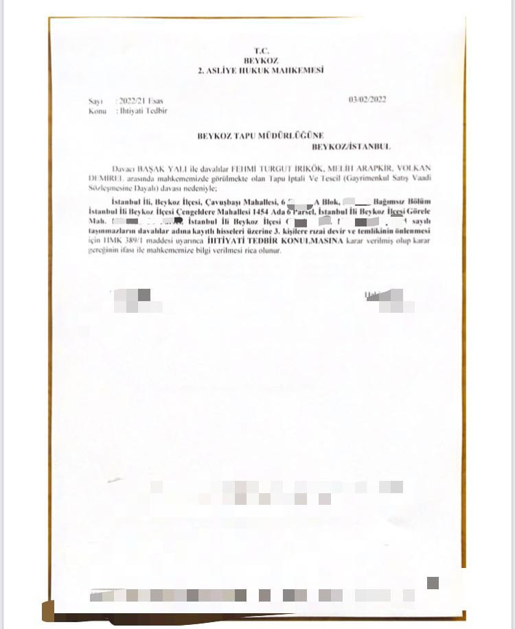 Başak Yalı’nın avukatı Özgür Ozan Bulut 2. Asliye Hukuk Mahkemesi’ne başvurarak Volkan Demirel’in oturduğu villanın satışına engel olmak için tedbir kararı koydu.