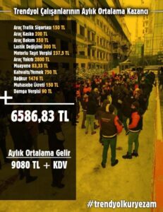 Trendyol Express çalışanları ise, Trendyol ile her sene paket başına anlaşma yaptıklarını, bu anlaşmanın geçen yıl 4,75 TL + KDV olduğu bilgisini verdi. Aylık gelirinin yüzde 11’lik zam sonrası 9 bin TL’den 10 bin TL’ye çıktığını anlatan çalışanlar, bu kazançtan araç yakıtı, sigorta, bakım masrafı ve vergiler gibi tüm masraflar çıkarıldığında kendilerine kalan net tutarın 3 bin 500 TL ila 4 bin TL dolaylarında olduğunu ifade etti.