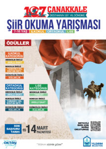 Bursa – Yıldırım Belediyesi, Çanakkale Deniz Savaşı’nda verilen bağımsızlık mücadelesi ve zaferin 107’nci yıl dönümünü Yıldırım’da yaşatıyor. Yıldırım Belediyesi, 7-16 yaş grubundaki öğrencilere yönelik Çanakkale Destanı’nın 107’nci yıl dönümüne özel resim çizme ve şiir okuma yarışması düzenliyor. İlkokul, ortaokul ve lise olmak üzere toplamda 3 kategoride gerçekleştirilen 18 Mart Çanakkale Zaferi ve Şehitleri Anma Günü Resim Yarışması ile Yıldırım Belediyesi, genç yeteneklerin eserlerini Barış Manço Kültür Merkezi’nde sergileyecek ve dereceye giren öğrencileri ödüllendirecek. Yine aynı şekilde 3 farklı kategoride gerçekleştirilen 18 Mart Çanakkale Zaferi ve Şehitleri Anma Günü Şiir Okuma Yarışması’nda dereceye giren öğrencilere birbirinden özel hediyeler verilecek.