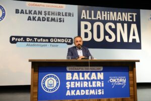 Yıldırım’da coğrafya okumaları devam ediyor Yıldırım Belediyesi’nin Balkan coğrafyasının; sosyolojik, tarihi ve siyasal durumunu detaylı şekilde ele aldığı ‘Balkan Şehirleri Akademisi’ tüm hızıyla devam ediyor. Toplamda; 8 hafta sürecek akademinin 6’inci haftasında konuk Prof. Dr. Tufan Gündüz ‘Allahimanet Bosna’ konu başlığı ile Bosna şehri üzerine konuştu.
