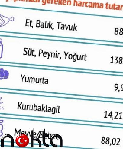 Sebze ve meyve için yapılması gereken günlük harcama tutarı ise 89.38 liraya ulaşırken; ekmek için yapılması gereken harcama tutarı günlük 33.38 lira, katı yağ ve sıvı yağ ise 23.99 lira oldu.