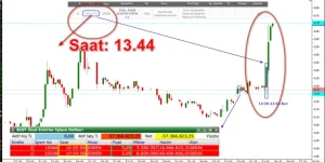 Fiyatı yaklaşık 4 saat yatay seyir izleyen hisse, 13;30-13;45 aralığındaki 15 dk’lık süreçte 5,25’den 5,42’ye yükselerek yaklaşık %3,2’lik bir artış gösterdi.